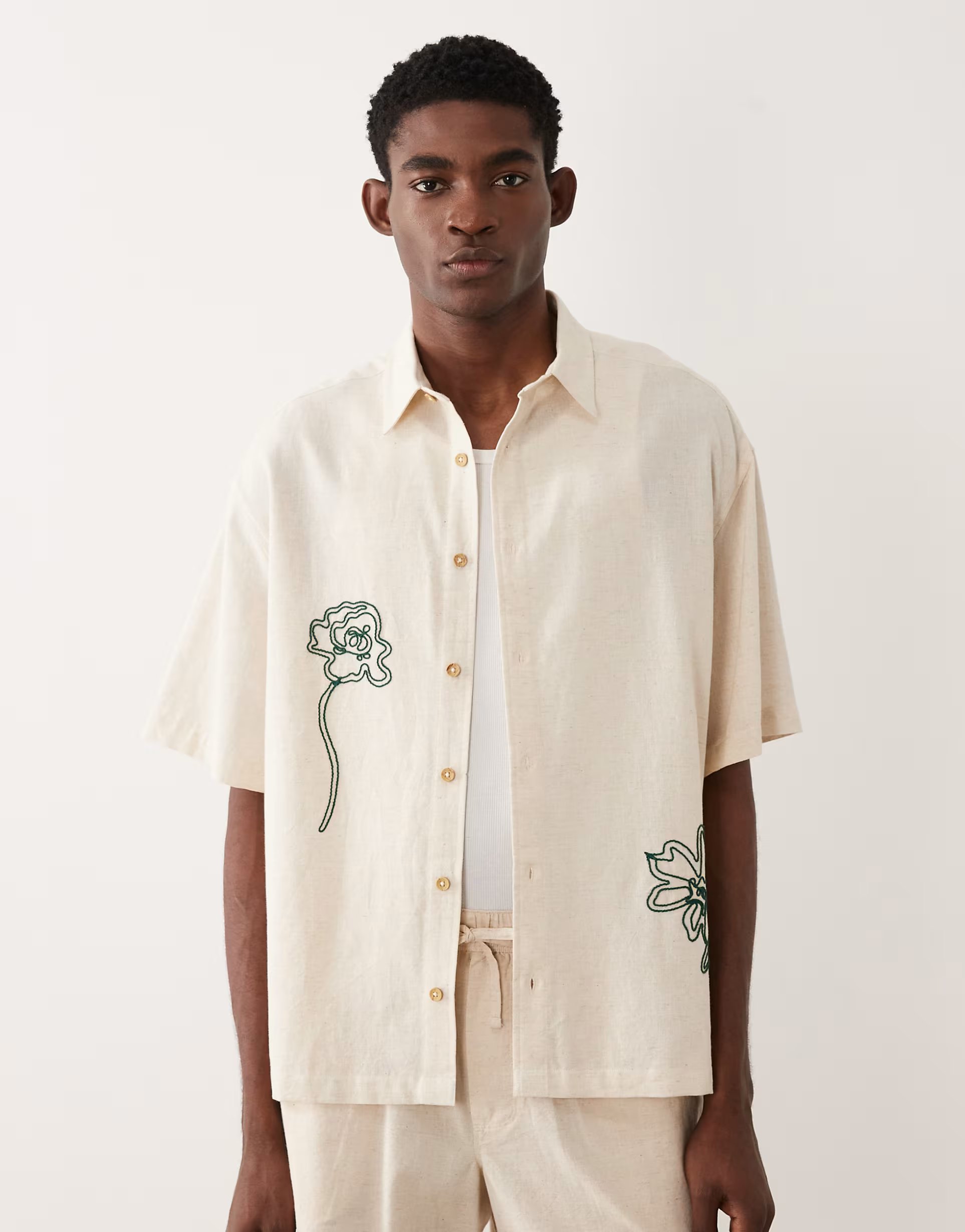 The ASOS Oversized Rope Embroidery Shirt in Natural is made from linen.