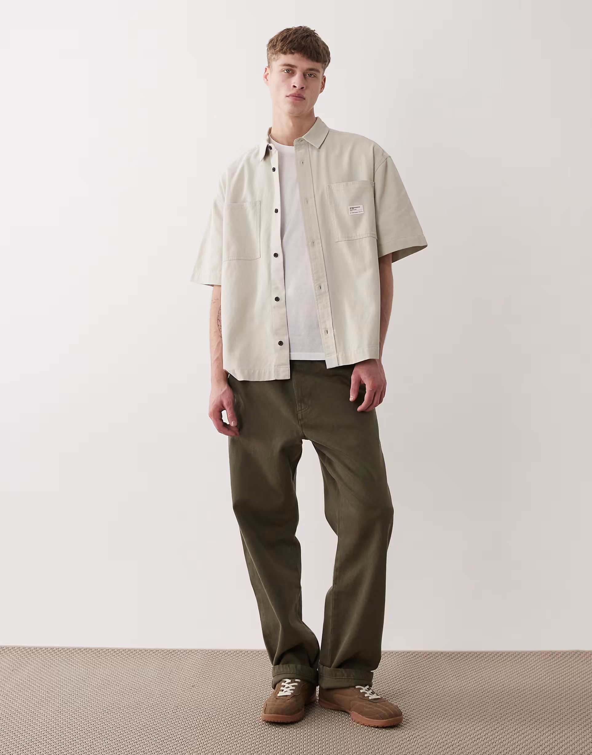 The ASOS Oversized Shirt with Workwear Badge in Stone is ideal for casual, smart-casual.