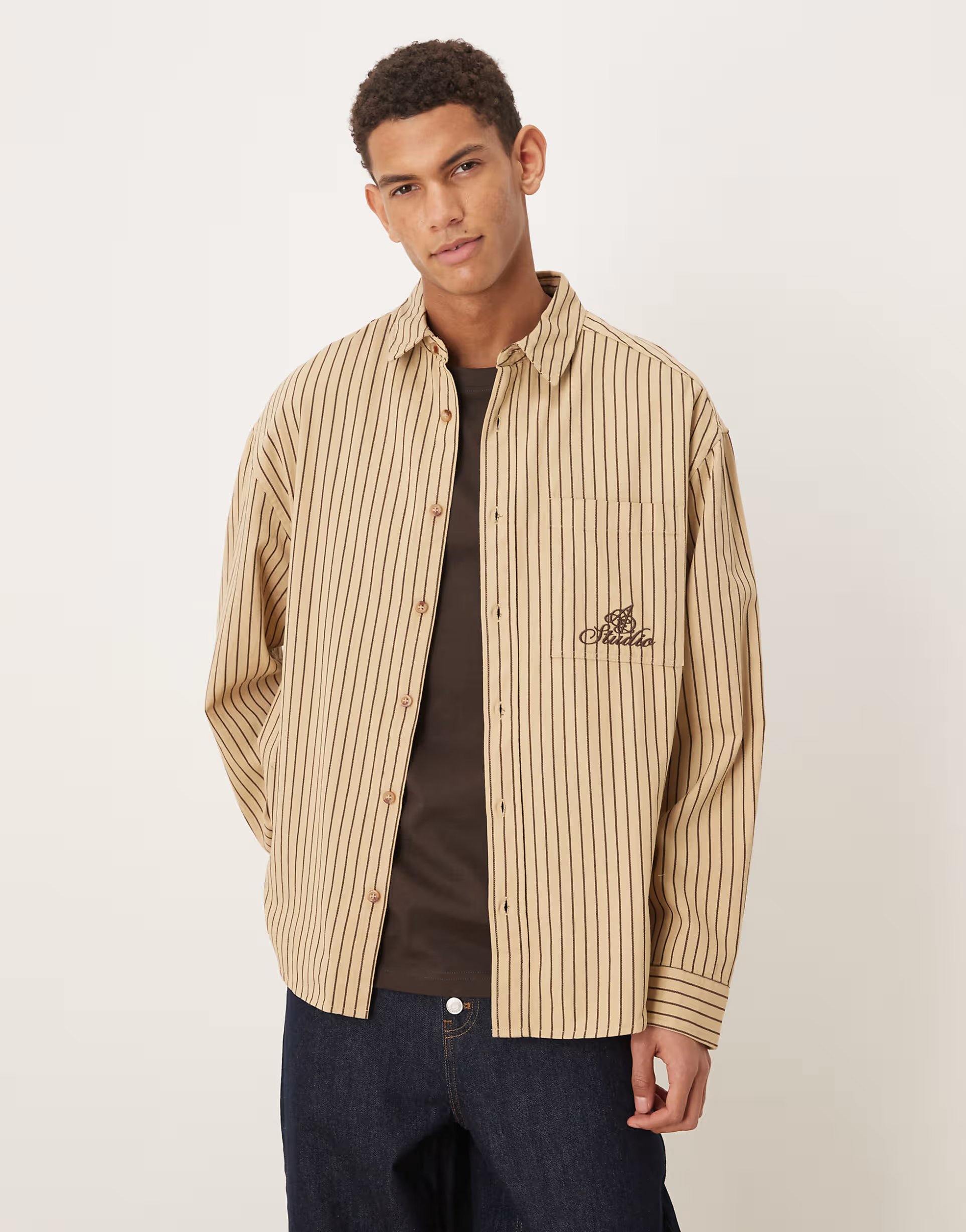 The ASOS Oversized Stripe Shirt with Chest Embroidery in Beige is ideal for casual, weekend.