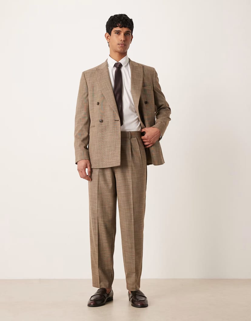 Crafted with a double-breasted button closure and tapered fit, these brown cross hatch suit trousers from ASOS DESIGN exude a timeless style. Perfect for business-casual settings.