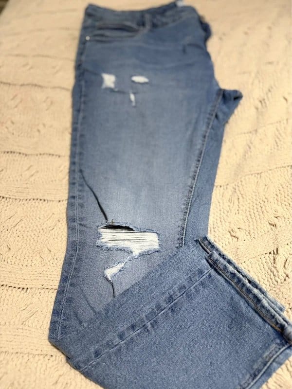 Casual light blue denim pants with a distressed look. Perfect for a relaxed, everyday style. Made from durable denim fabric.