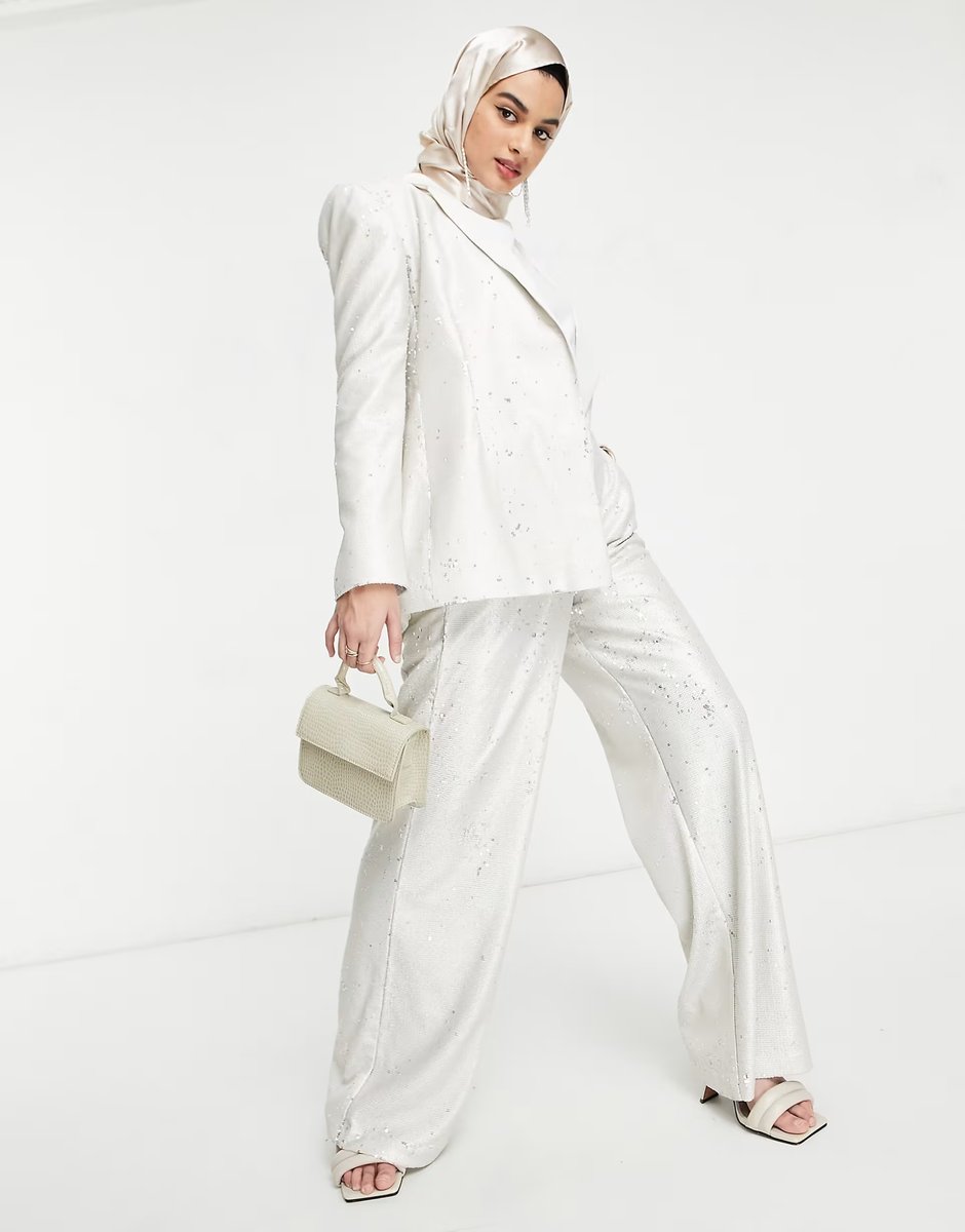 The ASOS DESIGN Premium Sequin Wide Leg Suit Trousers in Cream is ideal for evening, formal.
