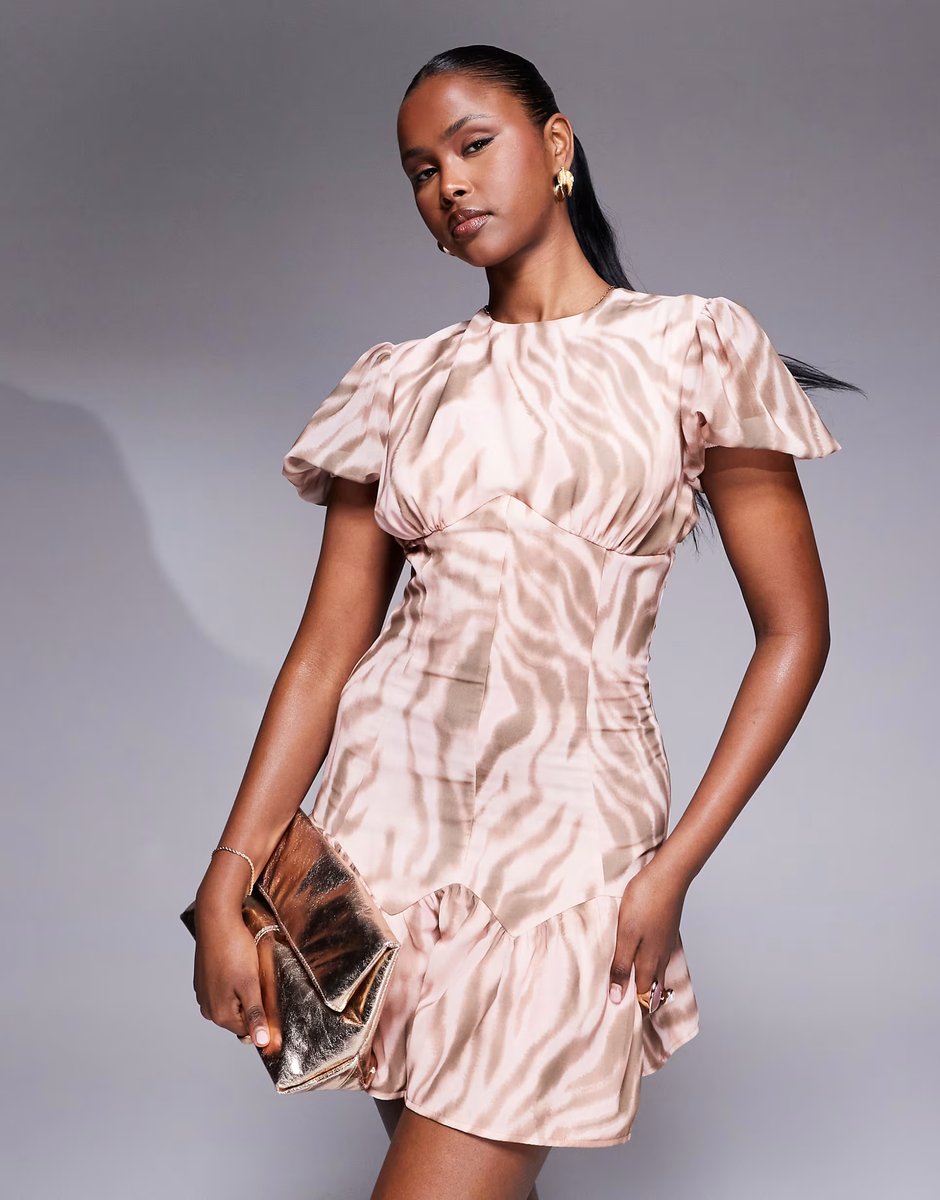 The ASOS Puff Sleeve Waisted Chiffon Mini Dress in Animal Print is ideal for evening, party.