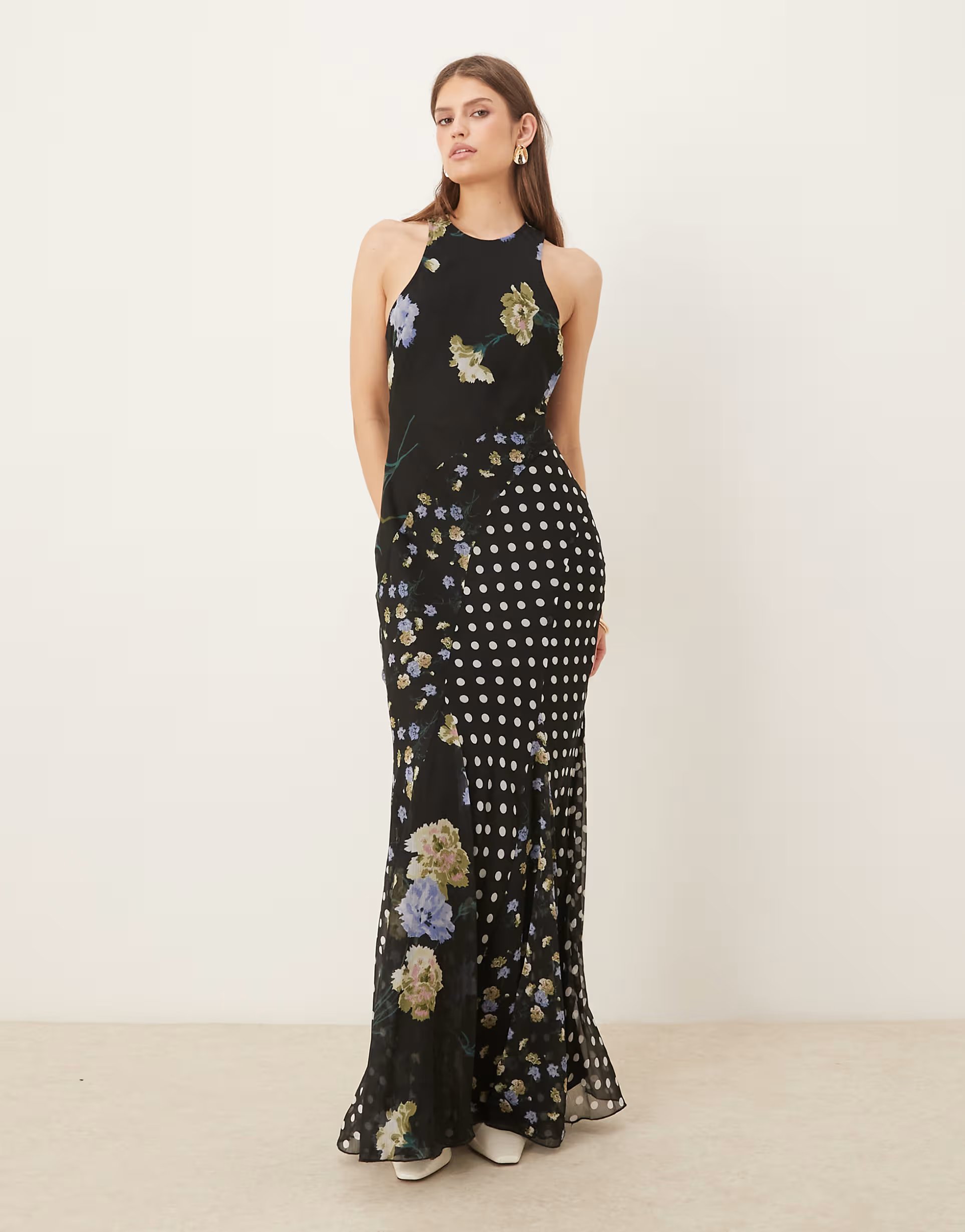 The ASOS Racer Neck Bias Maxi Dress in Mixed Floral Spot Print is made from polyester, elastane.