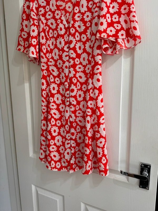 The ASOS Design Red & White Daisy Floral Button Tie Up Dress is available in sizes M.