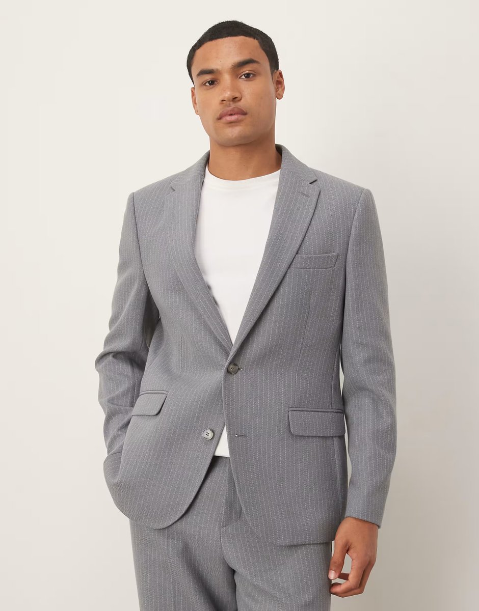 This grey pinstripe suit jacket from ASOS DESIGN features a regular fit that is ideal for various occasions. Crafted from wool, it offers a classic and polished look.