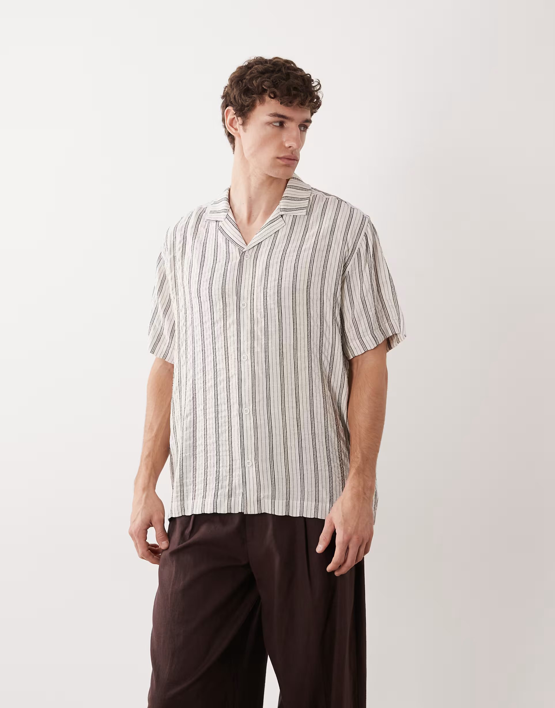 The ASOS Relaxed Textured Stripe Shirt in White features a textured stripe pattern and revere collar, offering a casual yet stylish look. Perfect for everyday wear.