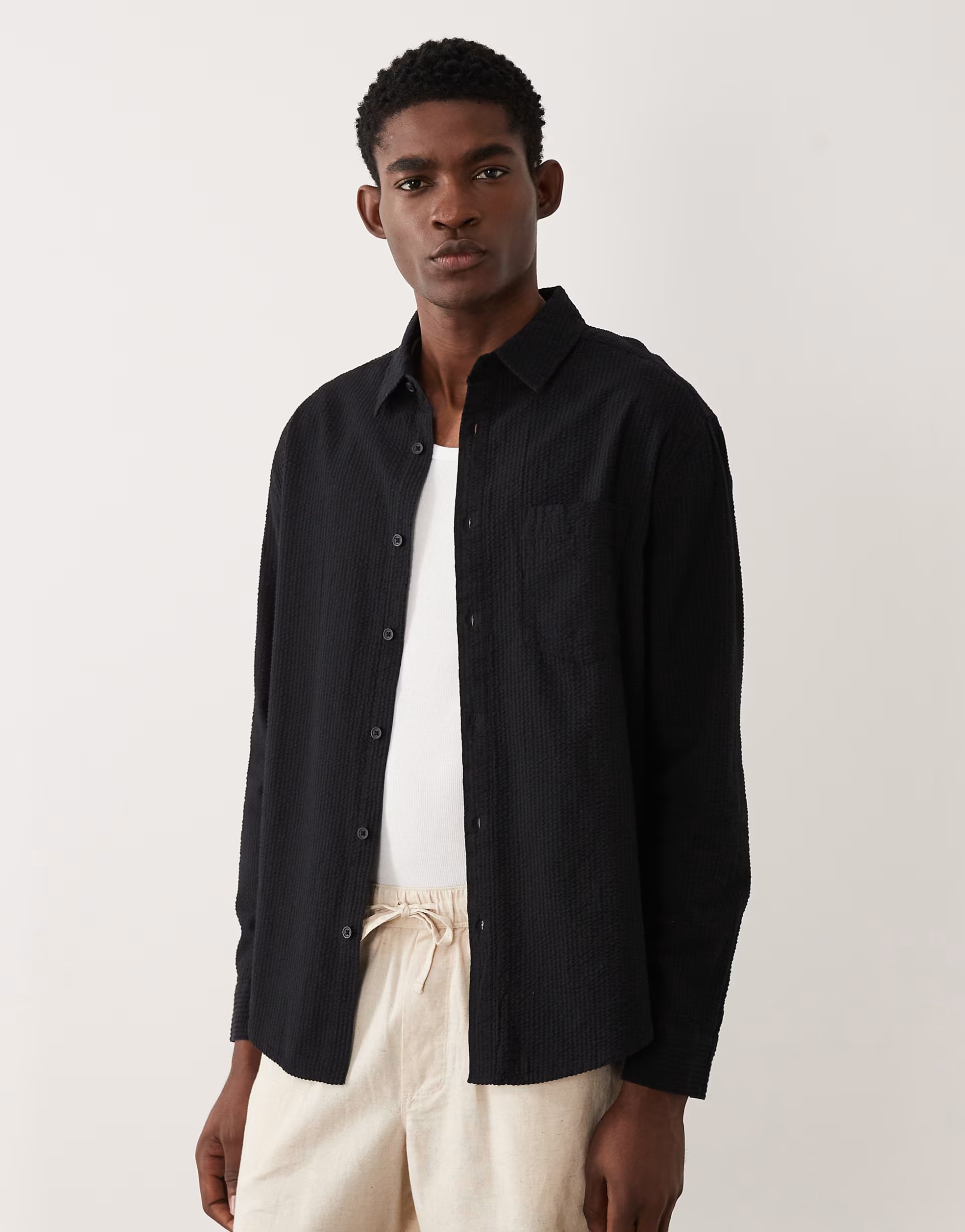 The ASOS Relaxed Seersucker Shirt in Black is ideal for casual, smart-casual.