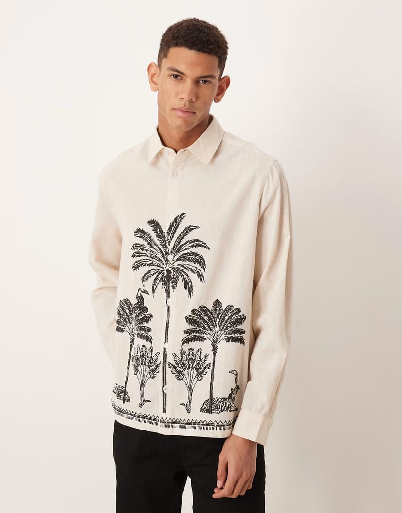 The ASOS DESIGN Relaxed Linen Shirt with Palm Print in Beige is made from linen.