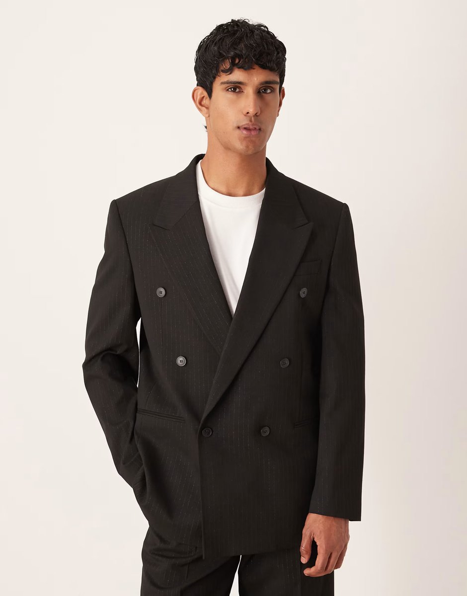 The ASOS DESIGN Relaxed Double-Breasted Blazer in Black Pinstripe is available in sizes XXXL, XXL, XL, XS, L, M, S.