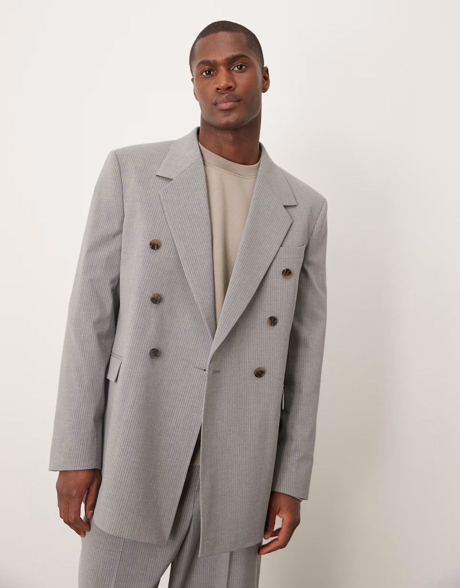 The ASOS DESIGN Grey Pinstripe Relaxed Suit Jacket is available in sizes XXXL, XXL, XL, XS, L, M, S.