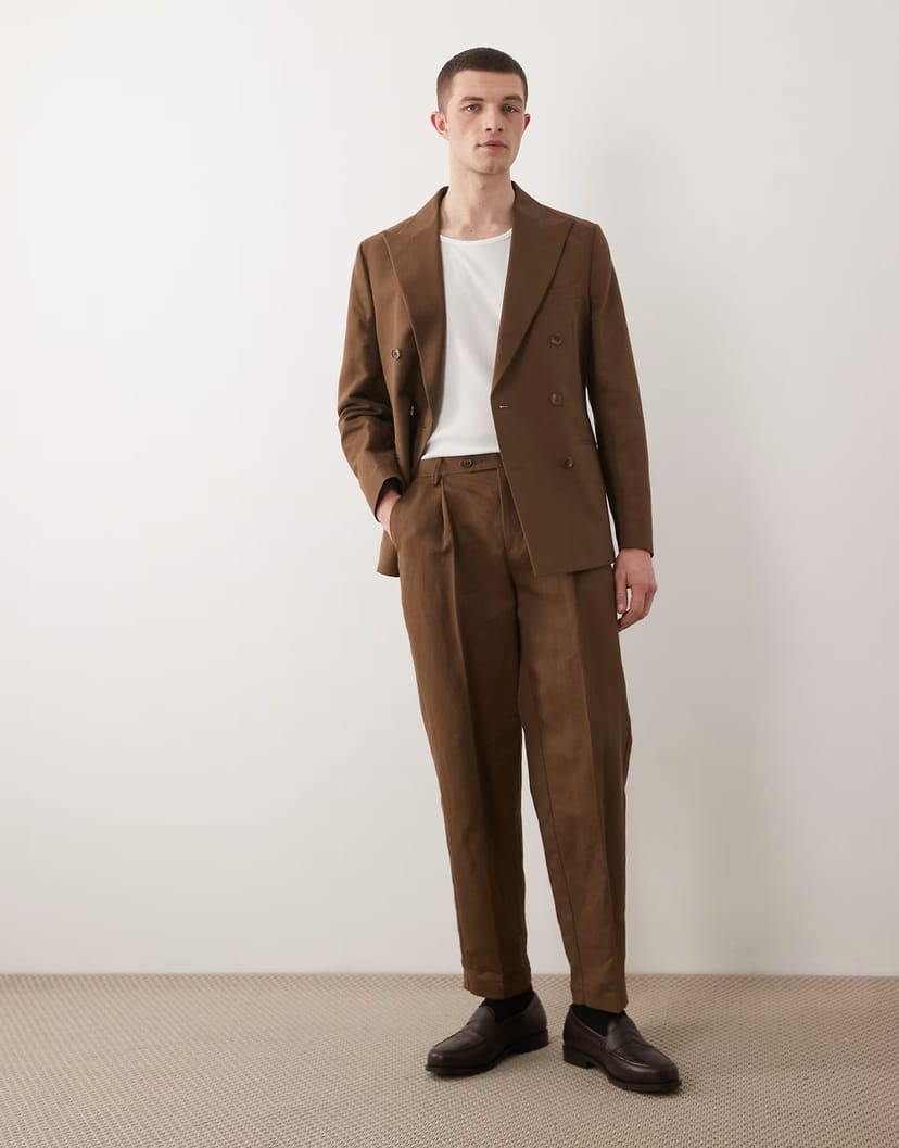 The ASOS DESIGN Dark Brown Double-Breasted Linen Trousers is made from linen.