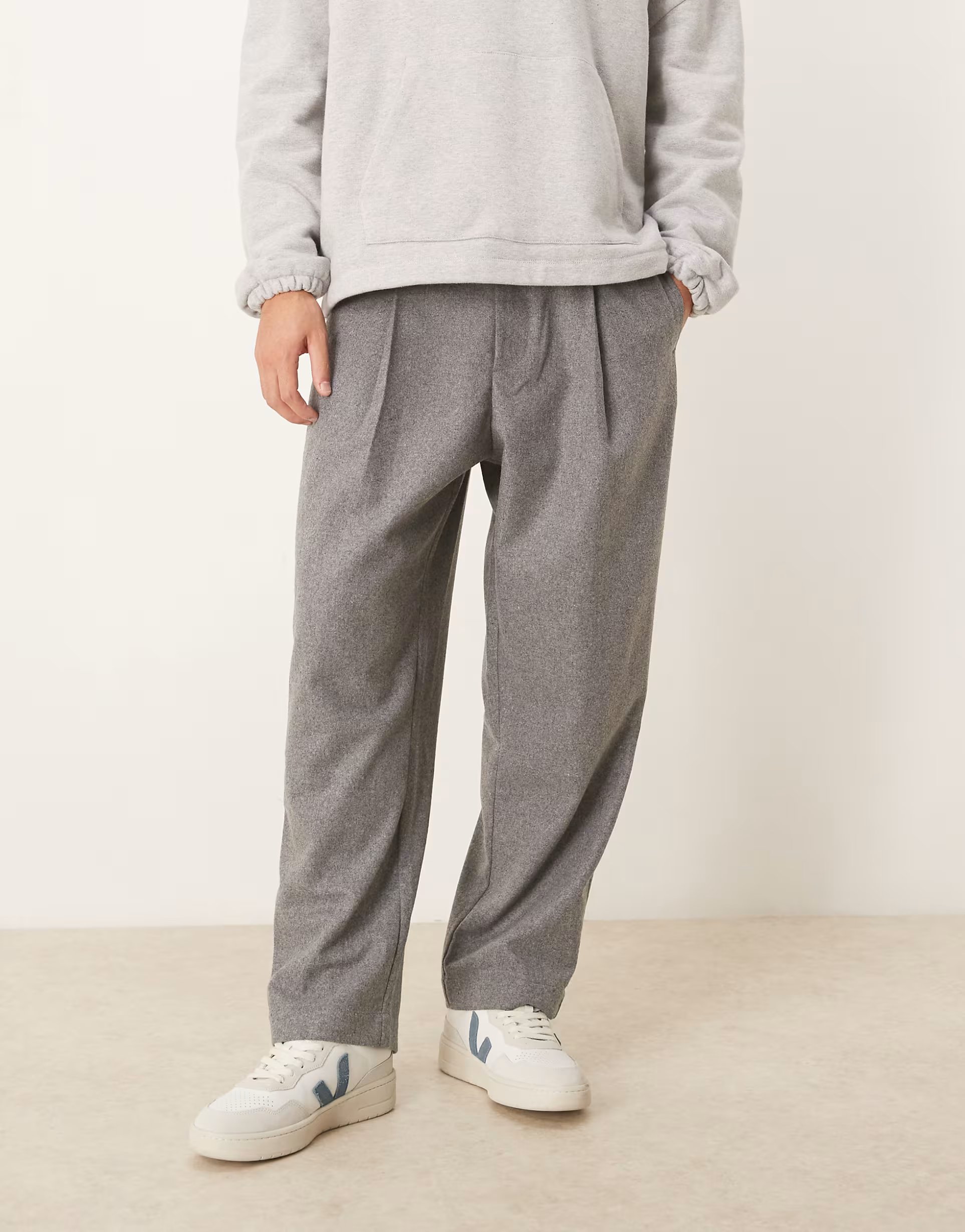 The ASOS DESIGN Grey Relaxed Tapered Wool Trousers is available in sizes XXXL, XXL, XL, XS, L, M, S.
