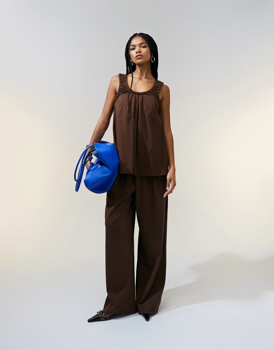 The ASOS DESIGN Chocolate Ruche Vest Top and Wide Leg Trousers Co-ord is ideal for casual, work, evening.