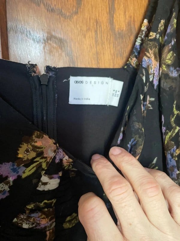 The ASOS Floral Ruche Puff Sleeve Mini Dress is made from polyester.