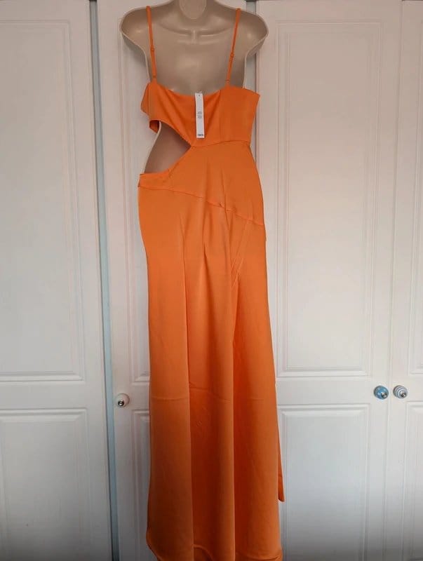 The orange satin midi dress boasts a cowl neck and cut-out waist for a flattering silhouette. Perfect for evening outings or special occasions.