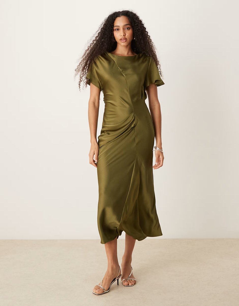 The ASOS DESIGN Olive Satin Flutter Sleeve Maxi Dress is ideal for evening, party, wedding-guest.