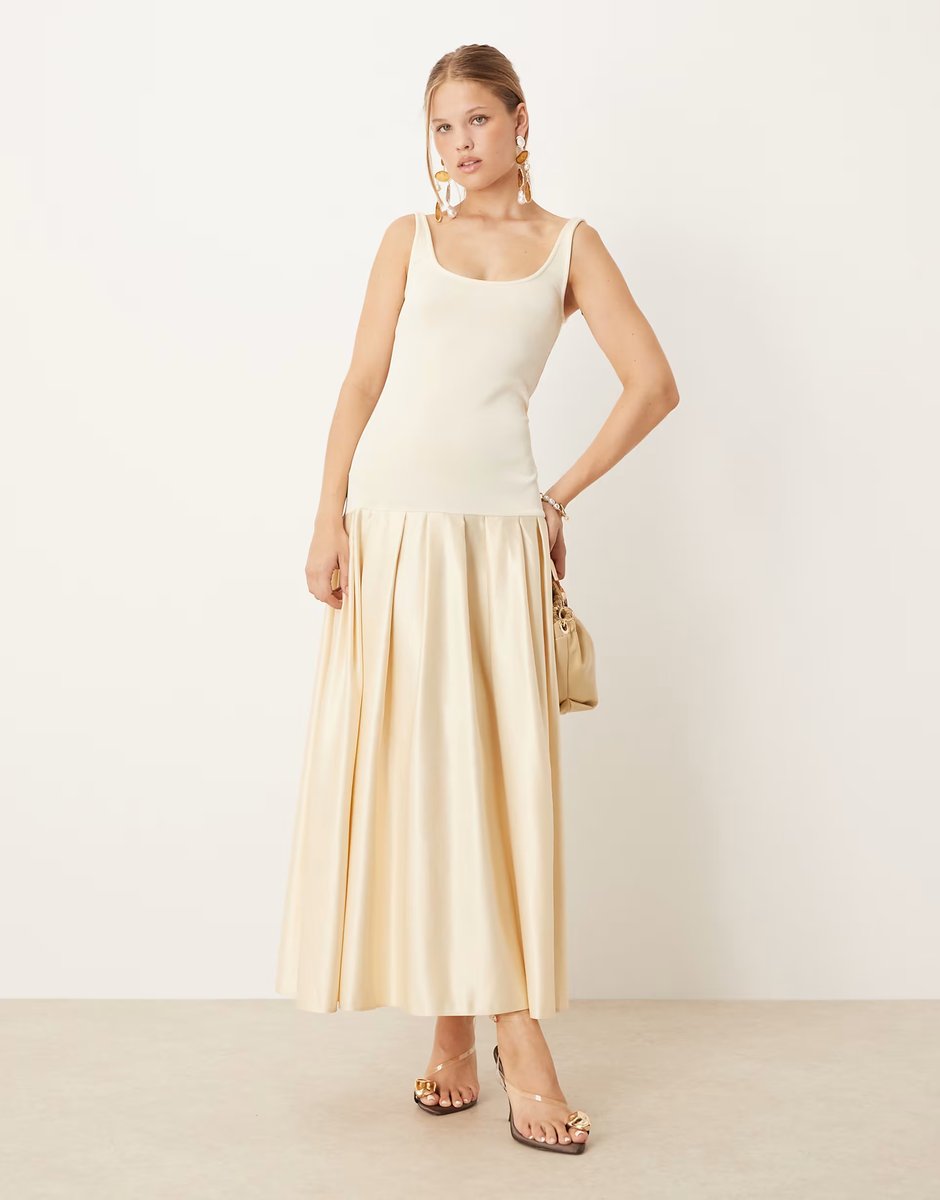 The ASOS Scoop Neck Drop Waist Midi Dress in Champagne is ideal for evening, party.