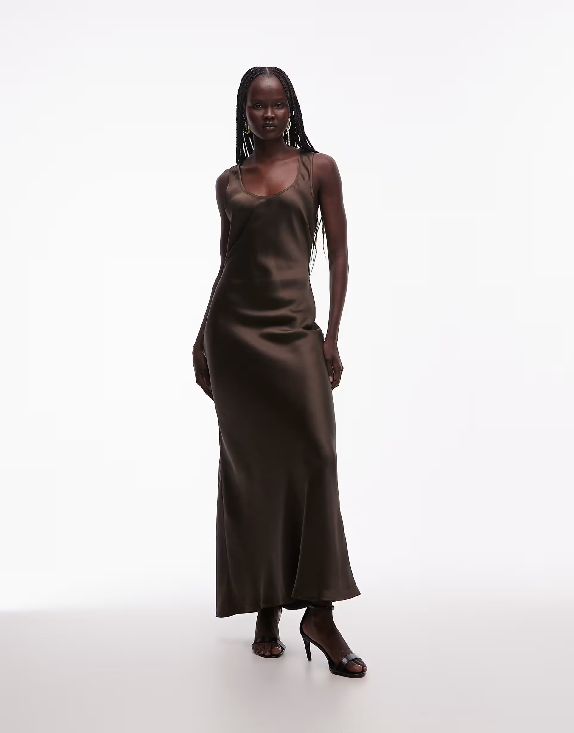 The ASOS Satin Scoop Maxi Dress in Chocolate is made from satin.