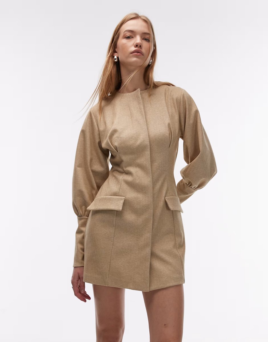 The ASOS Sculpted Puff Sleeve Blazer Mini Dress in Stone is ideal for casual, smart-casual.