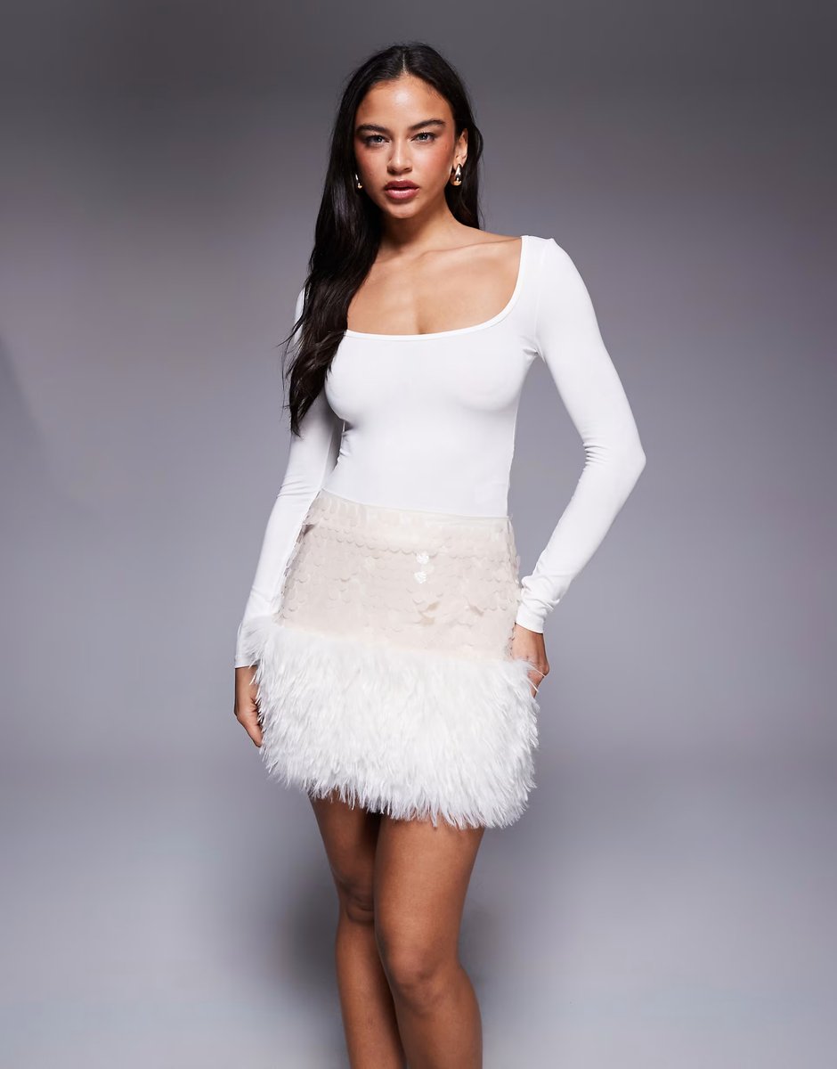 The ASOS DESIGN Sequin and Fur Mini Skirt in Cream is ideal for evening, party.