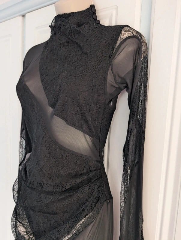 Black Sheer Mesh Mini Dress with Lace Panels — the must-have occasion dress for evening events, parties, and special occasions. Designed in black, this mini dress features lace panels and a sheer mesh body. Crafted from lightweight sheer mesh with lace detailing, it catches the light beautifully. Includes a full-length bodysuit for comfort and coverage.
