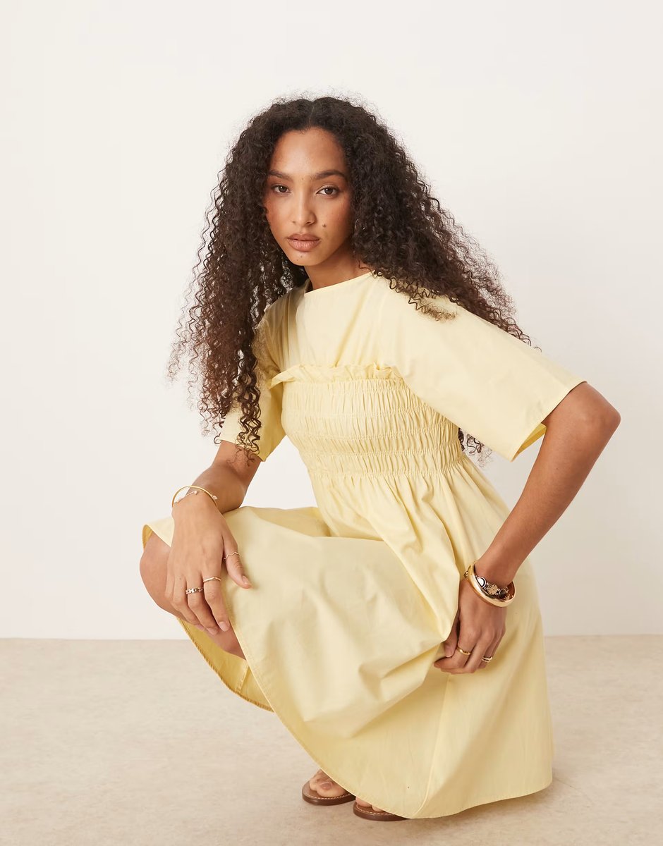 This buttermilk trapeze mini dress from ASOS DESIGN is perfect for a touch of flair. Featuring a shirred bodice and wide skirt, it's ideal for a casual evening out.