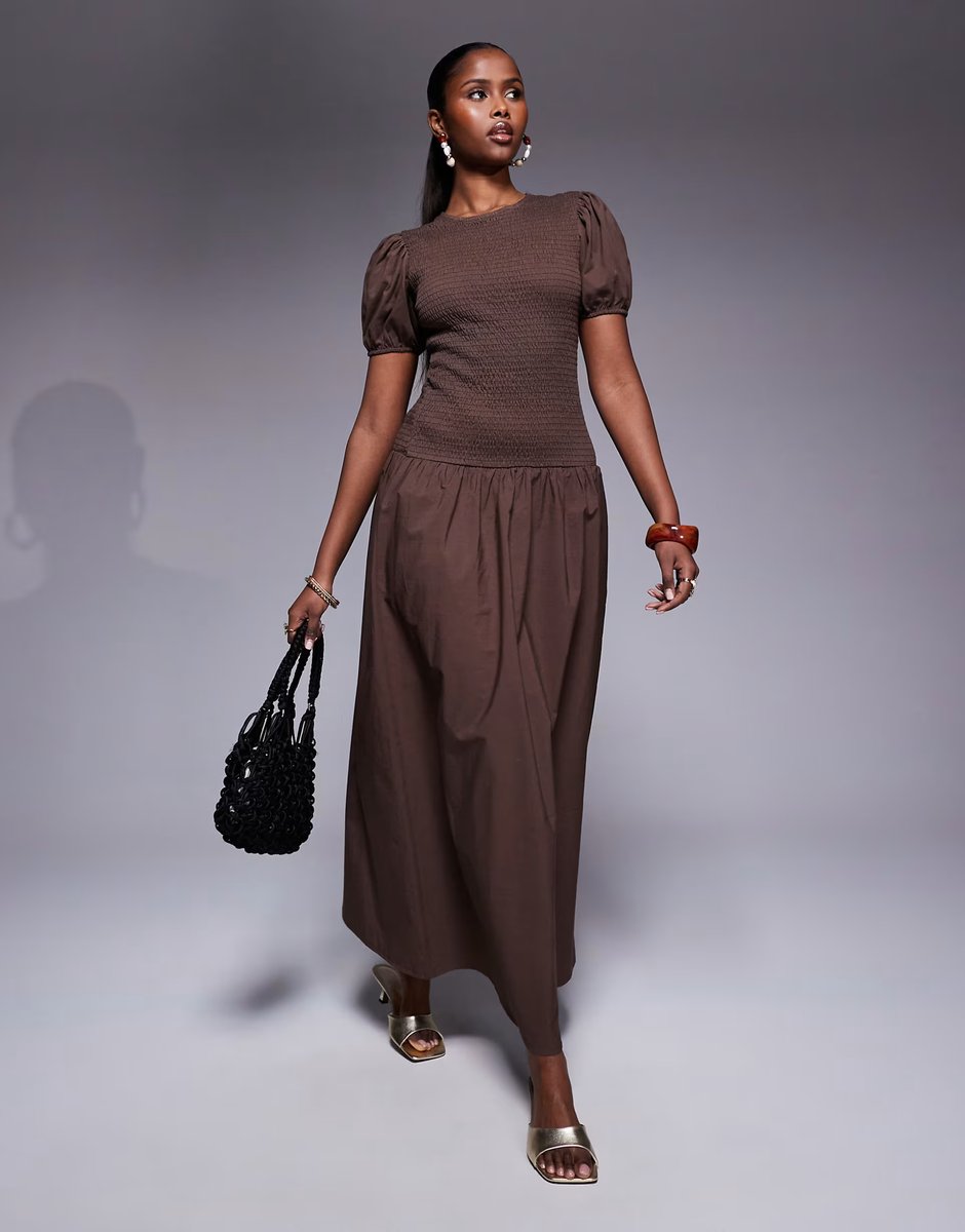 The ASOS Elegant Shirred Drop Waist Maxi Dress in Brown is available in sizes XXXL, XXL, XL, XS, L, M, S.