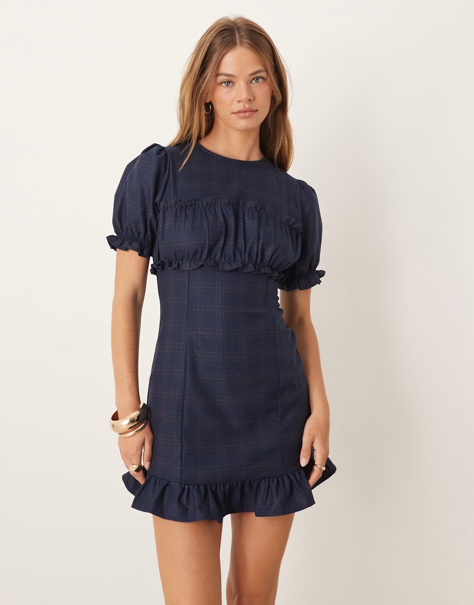 The ASOS Check Pattern Mini Dress with Ruffle Sleeves in Navy is ideal for casual, going out.