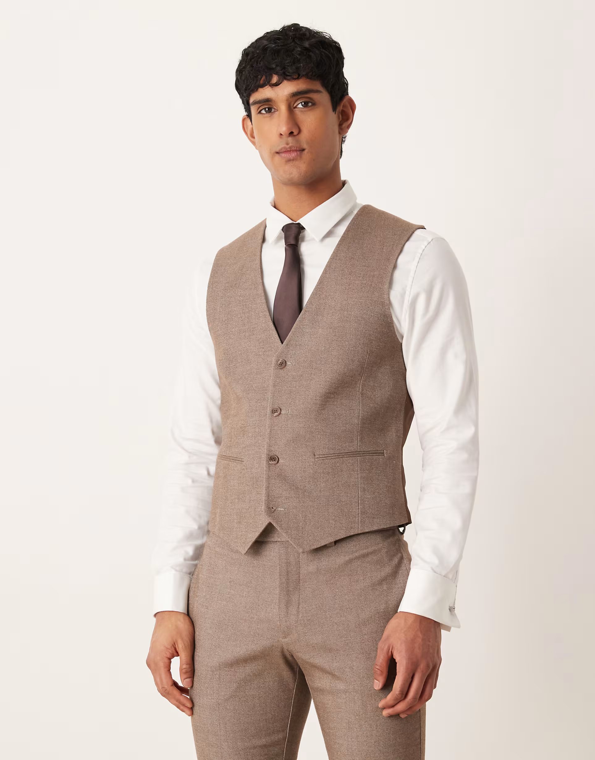 The ASOS Skinny Suit Waistcoat in Light Brown is made from twill.