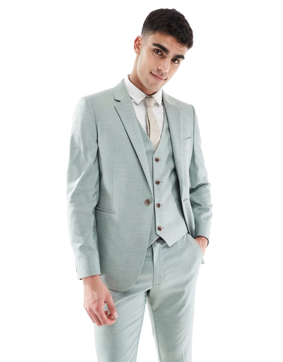 The ASOS DESIGN Skinny Wedding Suit Jacket in Sage Green Texture is ideal for wedding, formal.