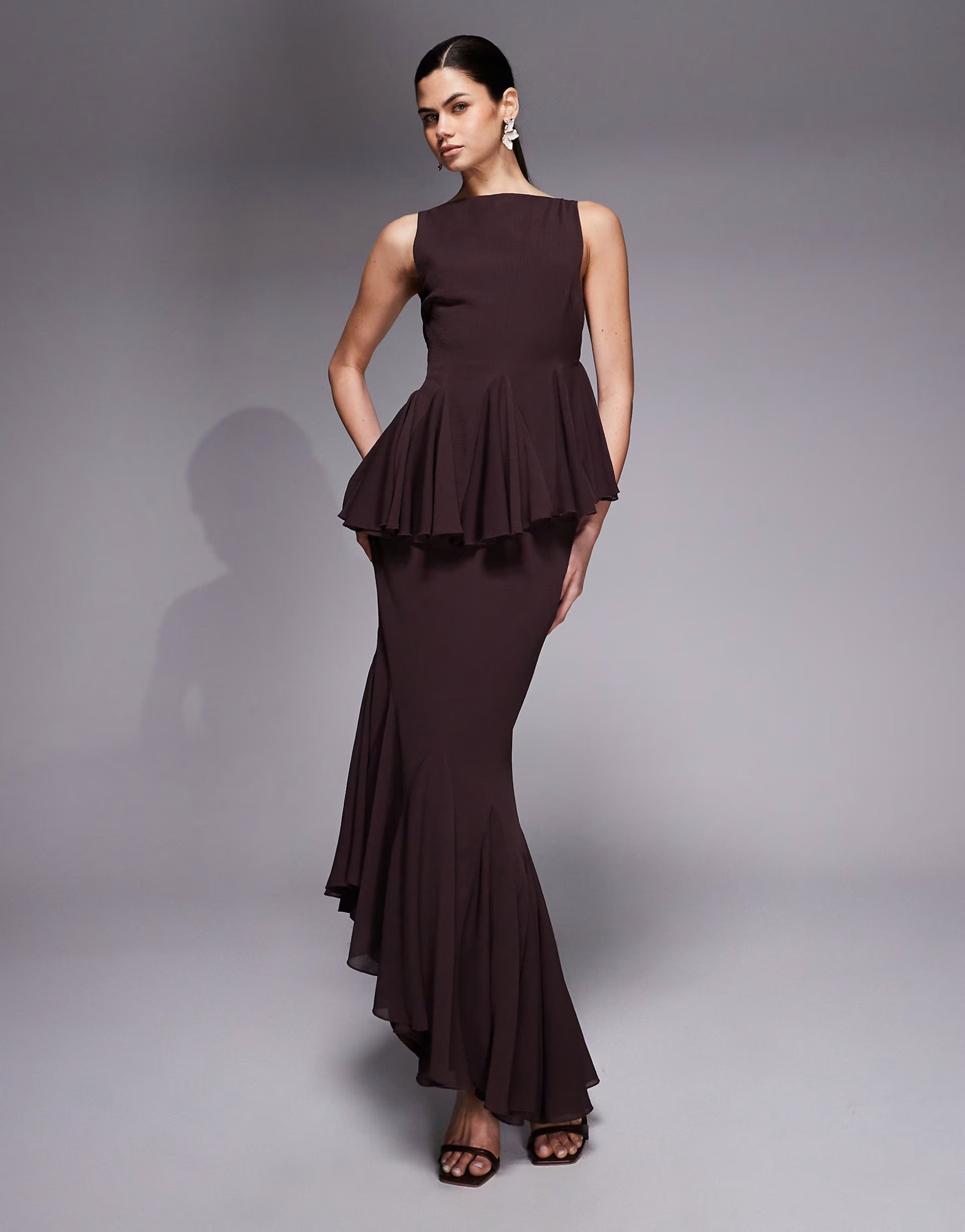 The ASOS DESIGN High Neckline Maxi Dress with Godets in Chocolate is ideal for evening, formal, date-night.