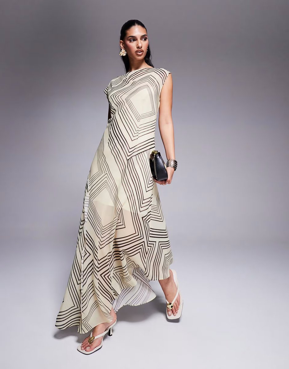 The `ASOS DESIGN Stripe Abstract Slash Neck Waisted Maxi Dress` is ideal for formal, evening, party.