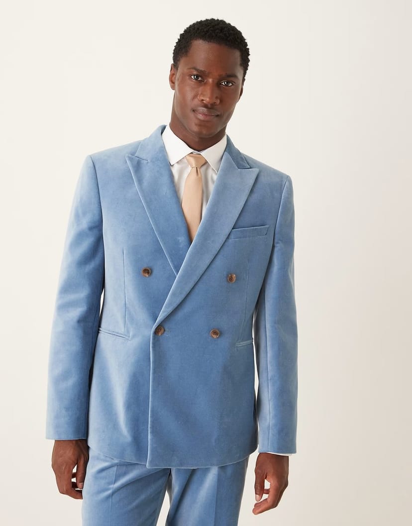 The ASOS DESIGN slim double breasted suit jacket is crafted in light blue cotton velvet. The jacket features a classic double-breasted front, perfect for formal and business occasions.