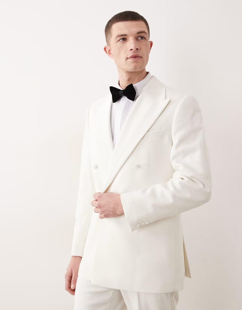The ASOS Double Breasted Tuxedo Jacket with Satin Detail in Ivory is ideal for formal, evening.