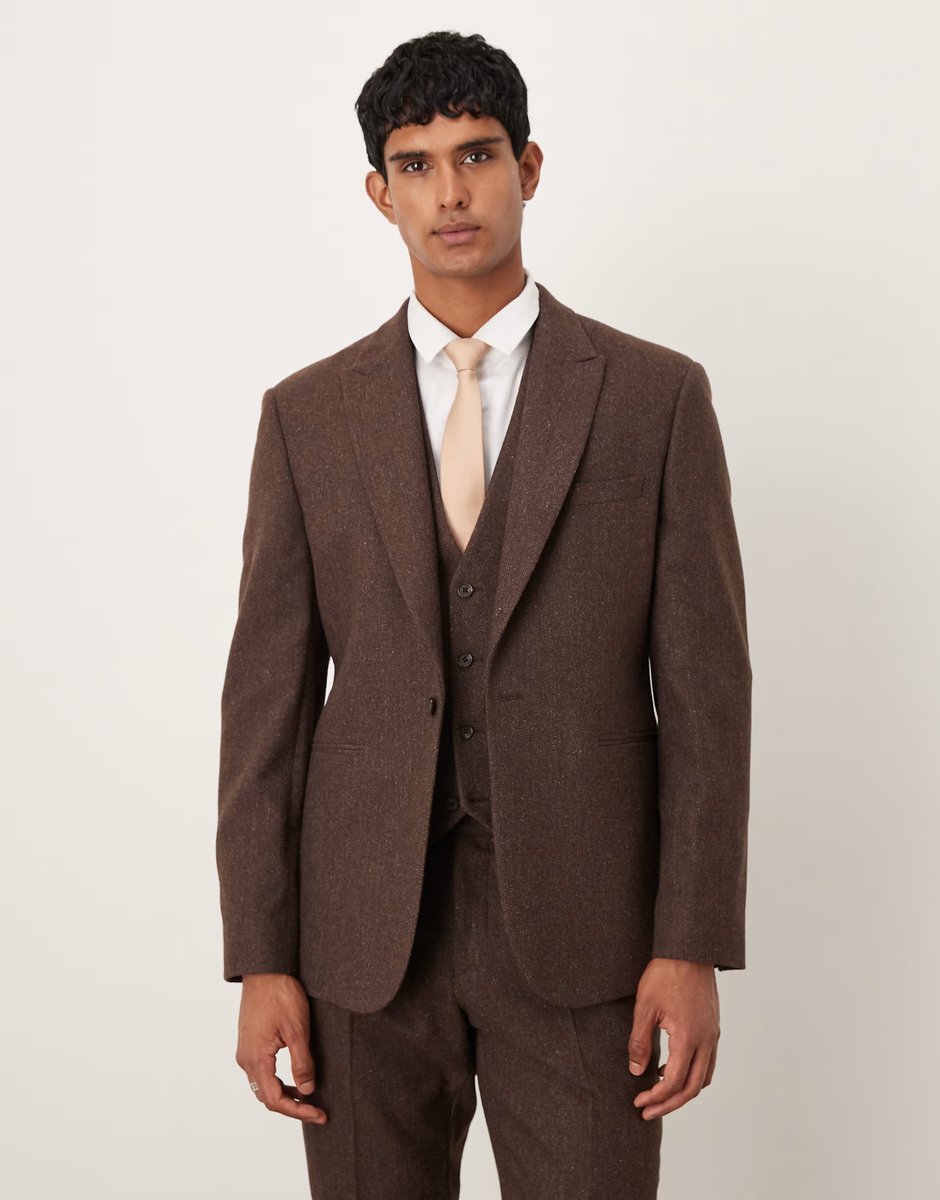 The ASOS Slim Herringbone Suit Jacket with Wool in Brown is ideal for business, casual.