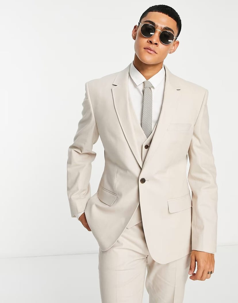 The ASOS DESIGN Slim Linen Mix Suit Jacket in Stone is available in sizes XXXL, XXL, XL, XS, L, M, S.