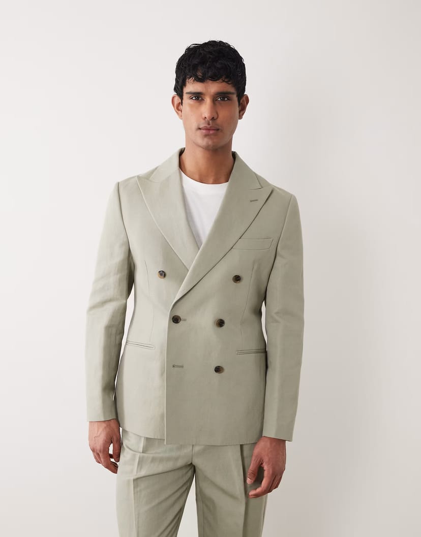 The ASOS DESIGN Slim Double-Breasted Khaki Linen Suit Jacket is made from linen.