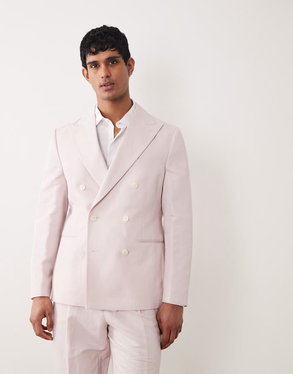 The ASOS Double Breasted Suit Jacket in Pink is made from linen.