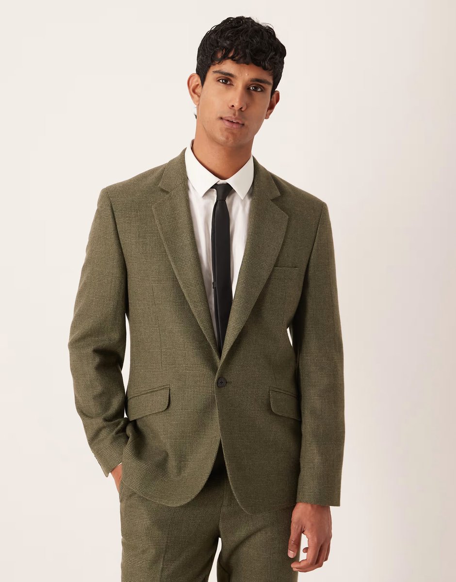 Elegant and sharp, this dark green check slim suit jacket from ASOS DESIGN is tailored for a modern fit. Perfect for formal occasions, it combines style with a sleek, contemporary design.