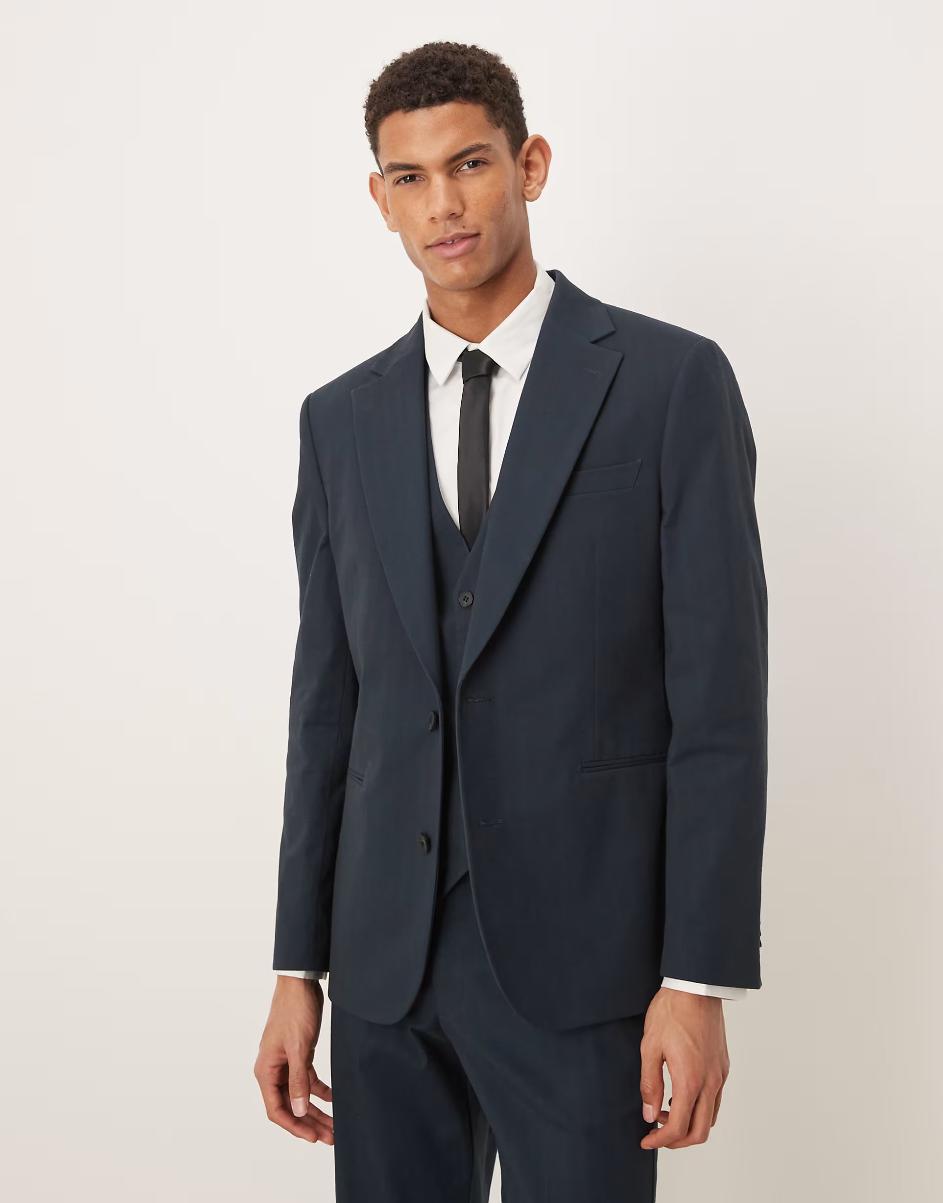 The ASOS Slim Fit Navy Herringbone Suit Jacket is made from wool.