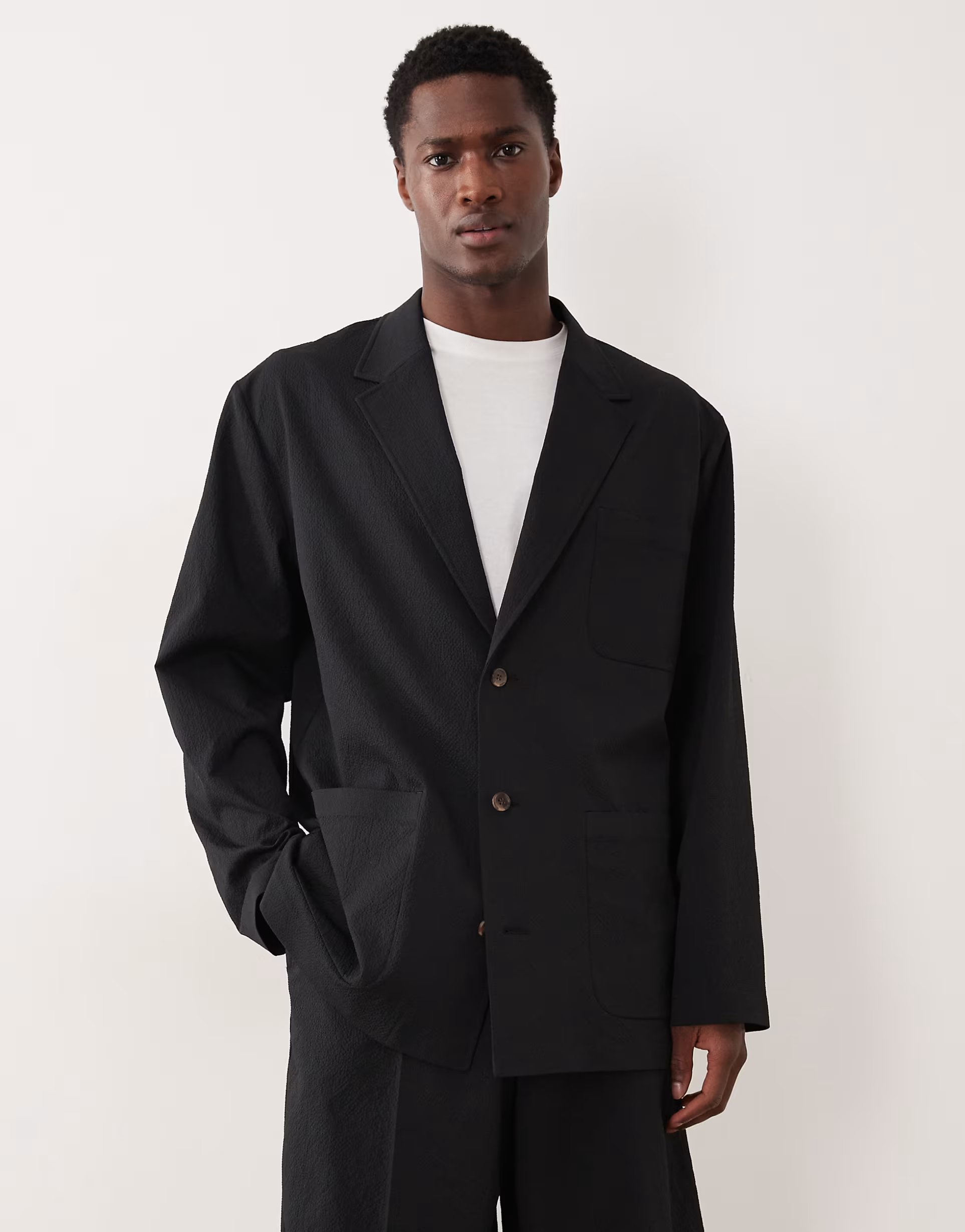 The ASOS Slouchy Boxy Jacket in Black Seersucker is ideal for casual, smart-casual.