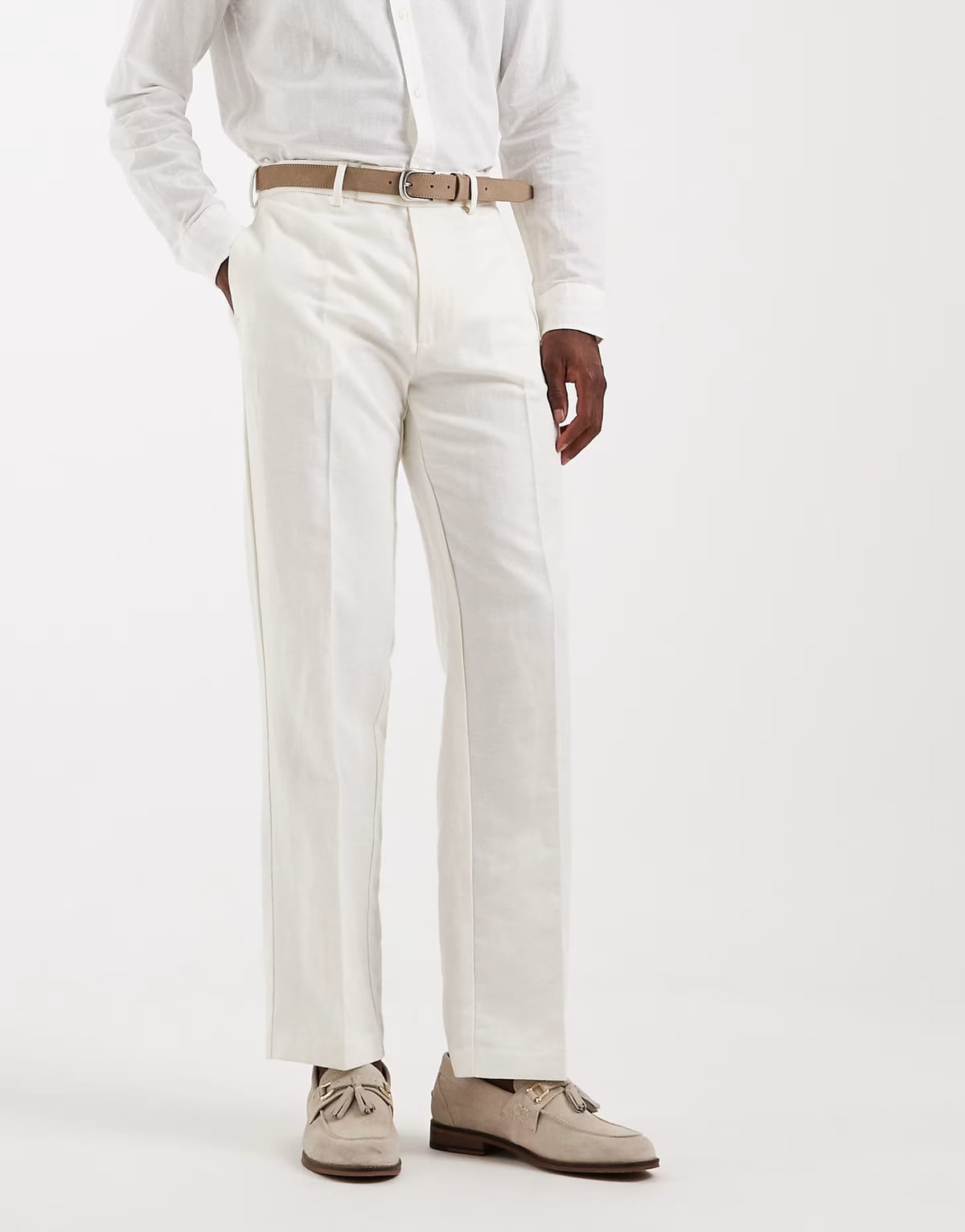 See all outfit ideasStylish white linen straight leg trousers by ASOS DESIGN. Crafted from lightweight linen, these trousers offer a relaxed fit and a classic straight leg silhouette. Perfect for warm-weather dressing.