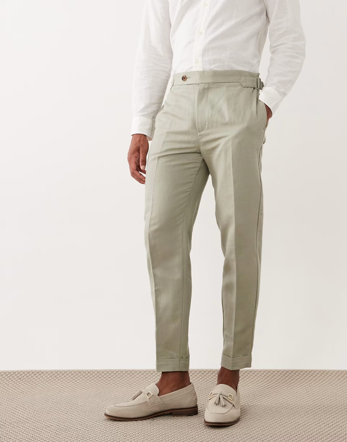Stylish ASOS smart linen rich tapered trousers in sage green with side adjuster detail and turnups. Perfect for a smart-casual look.