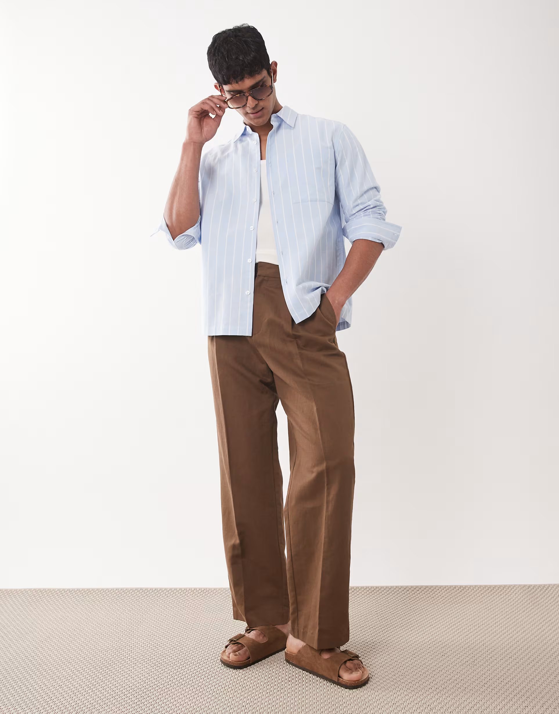 The ASOS DESIGN Smart Pleated Linen Wide Leg Trousers in Dark Brown is ideal for smart-casual, business, weekend.