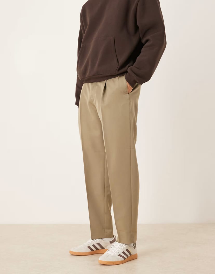 The ASOS Smart Pleated Oversized Tapered Trousers in Khaki is ideal for business, smart-casual.
