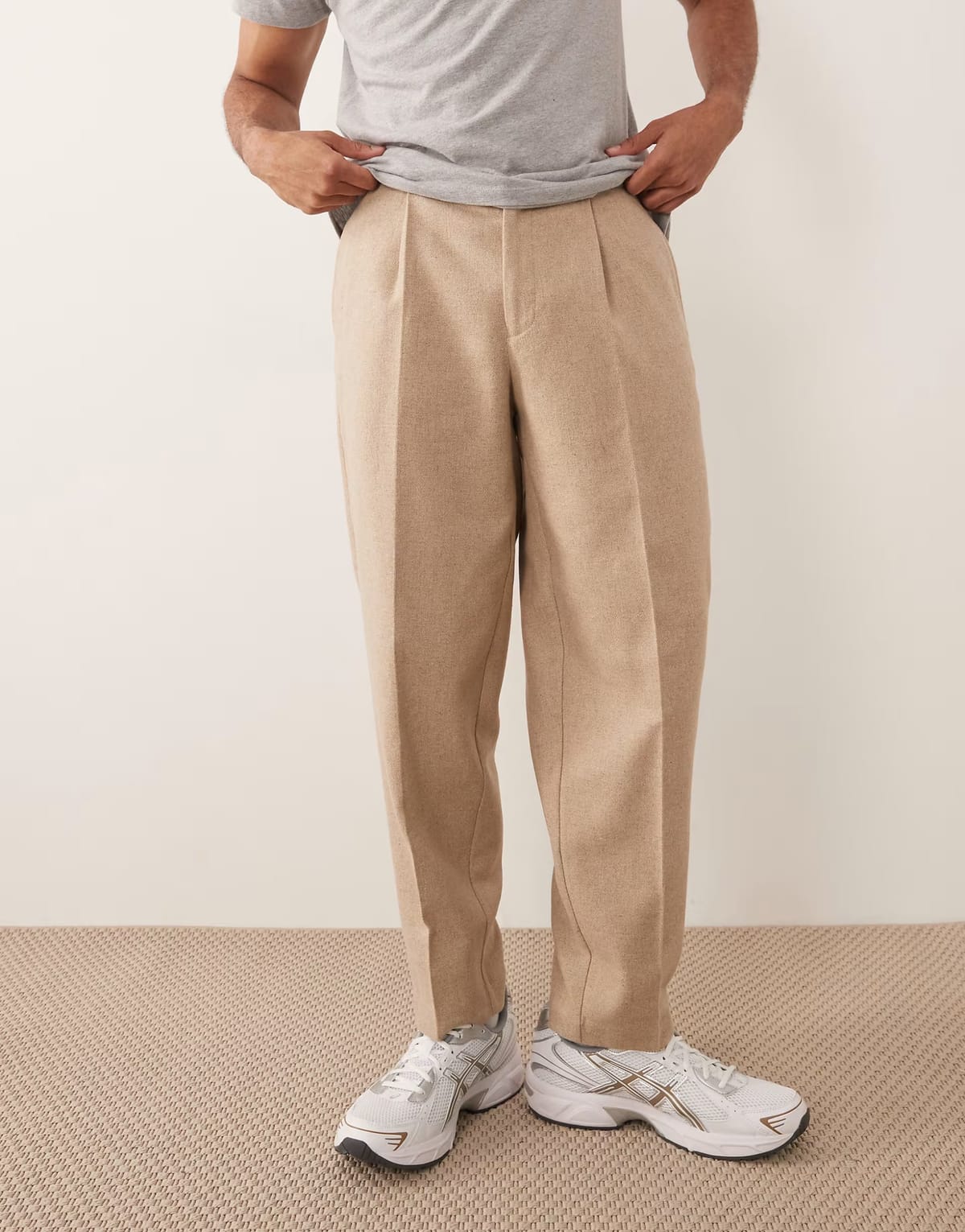 Smart oversized tapered trousers in stone wool blend featuring a pleated front and tapered fit. Ideal for a relaxed yet polished look.