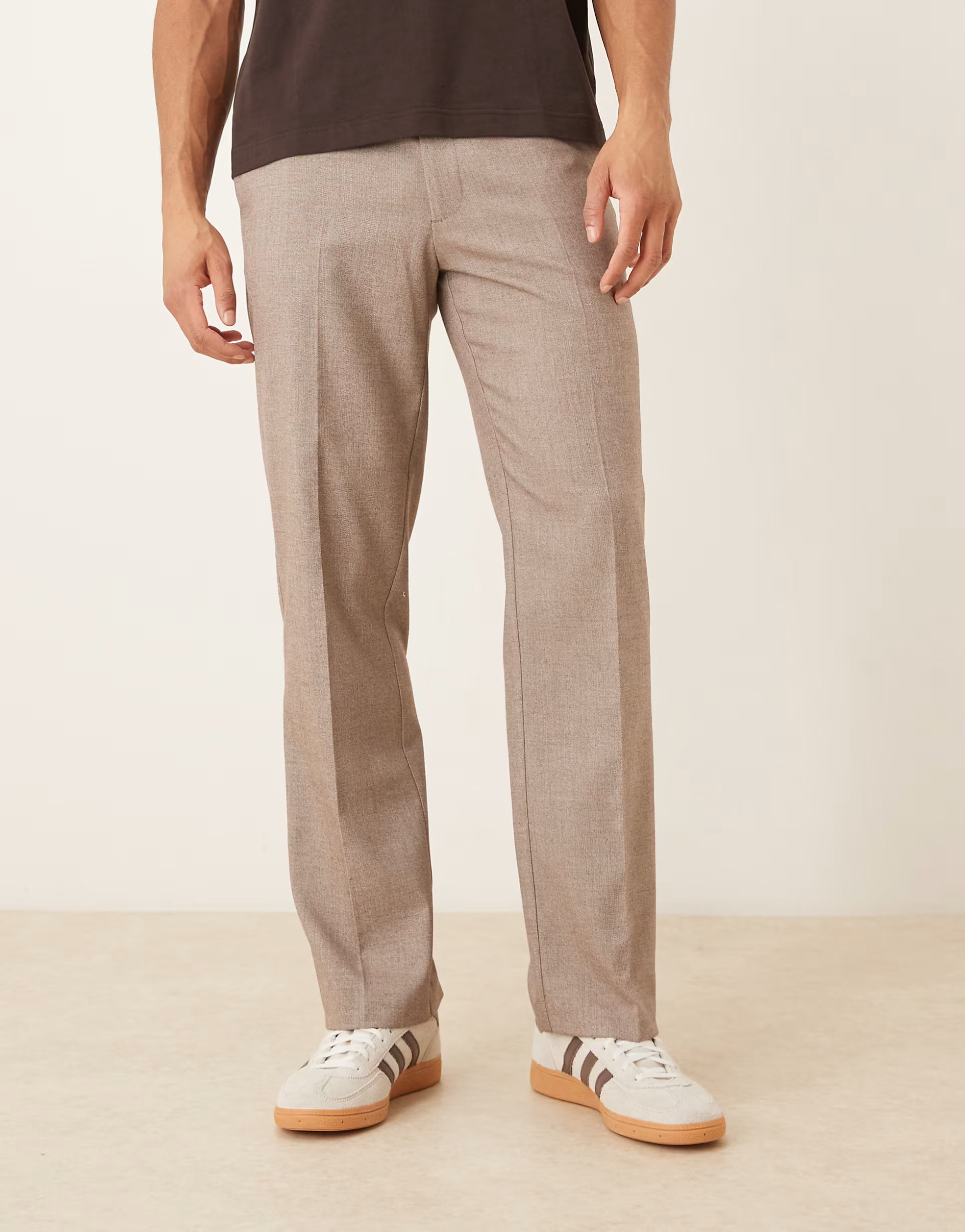The ASOS DESIGN smart straight leg trousers in brown texture feature a textured finish for a stylish look. Perfect for smart-casual occasions, these trousers offer a comfortable fit and versatile styling options.