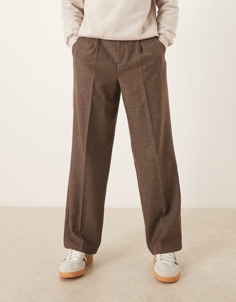 The ASOS Smart Wide Leg Double Pleated Trousers in Brown is made from wool blend.