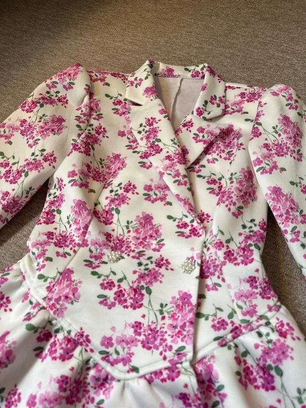 Pink Floral Long Peplum Jacket — the must-have occasion jacket for weddings and events this spring and summer. Designed in vibrant pink floral, this long jacket features peplum style, pearl/sparkle buttons, and shoulder pads. Crafted from scuba material with amazing quality, it is perfect for any formal occasion. Includes a full-length jersey slip lining for comfort and coverage.